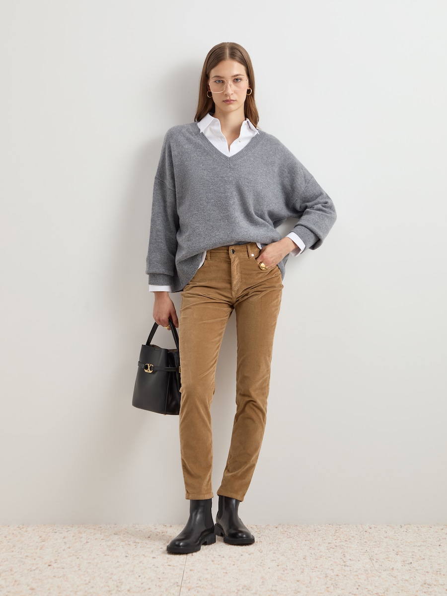 Para conferir um toque elegante e confortável ao seu look, propomos estas calças de veludo confecionadas em algodão com uma pequena percentagem de elastano para maior liberdade de movimentos. De corte regular e cintura subida, apertam com fecho oculto por carcela e botão. Finalizam com cinco bolsos e presilhas para o cinto. Disponíveis em duas cores.