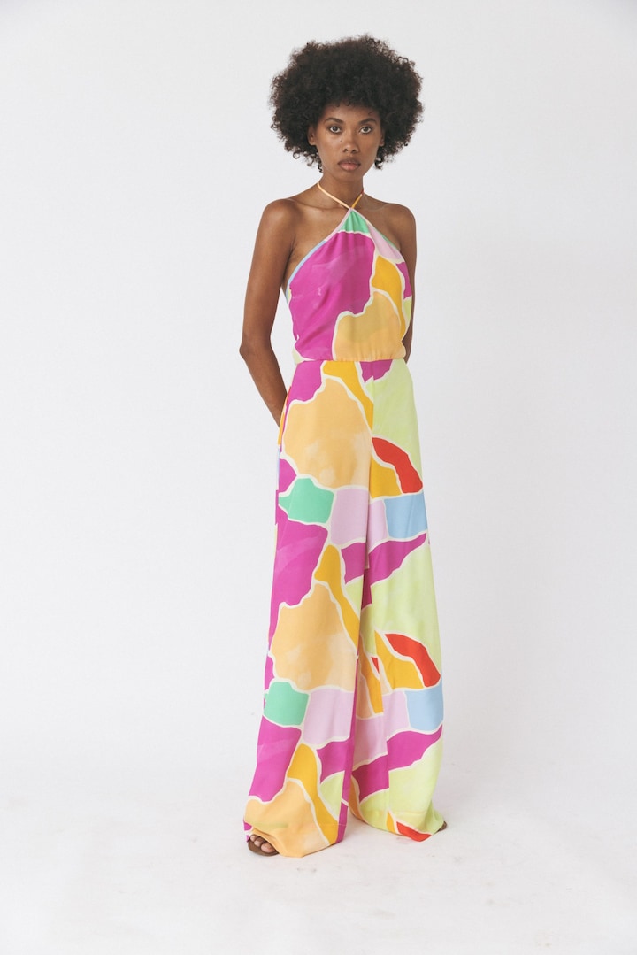 Macacão em seda, Aperta no pescoço e grande decote as costas Calças Pantalona Estampado exclusivo. Feito em Portugal