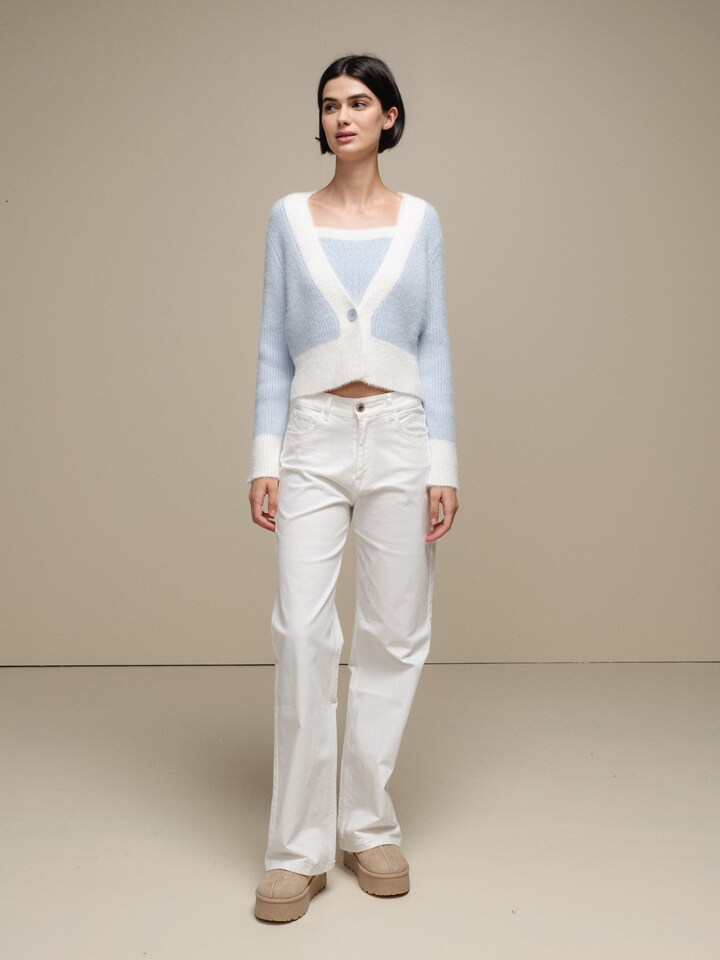 Casaco de malha curto em contraste de cores e decote em bico