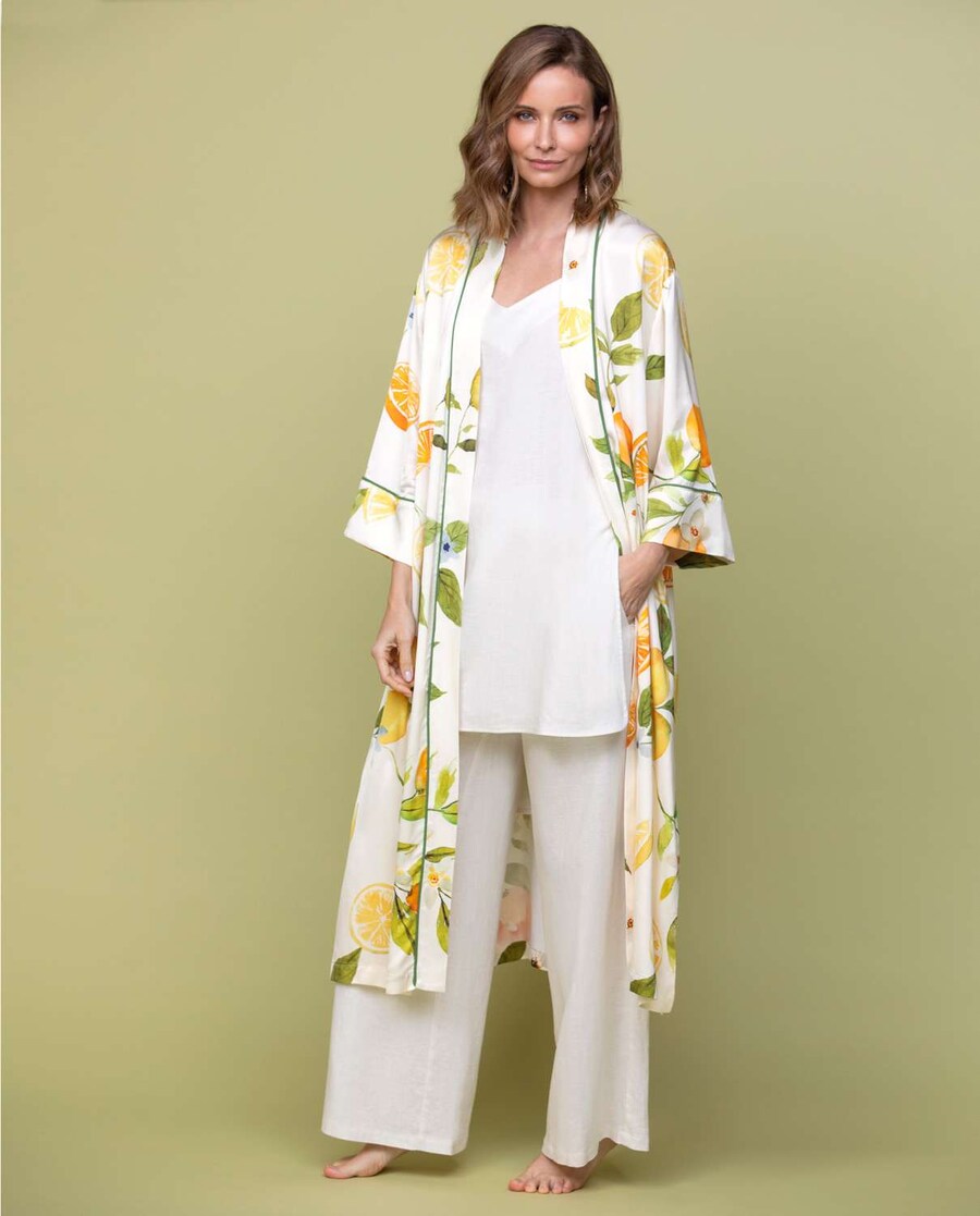 Kimono longo com mangas compridas e bolsos laterais. Estampado digital “Citric Bloom” all-over exclusivo Greenkiss. Todos os nossos estampados foram desenhados e pintados à mão por artistas plásticos portugueses. Produzido em Portugal