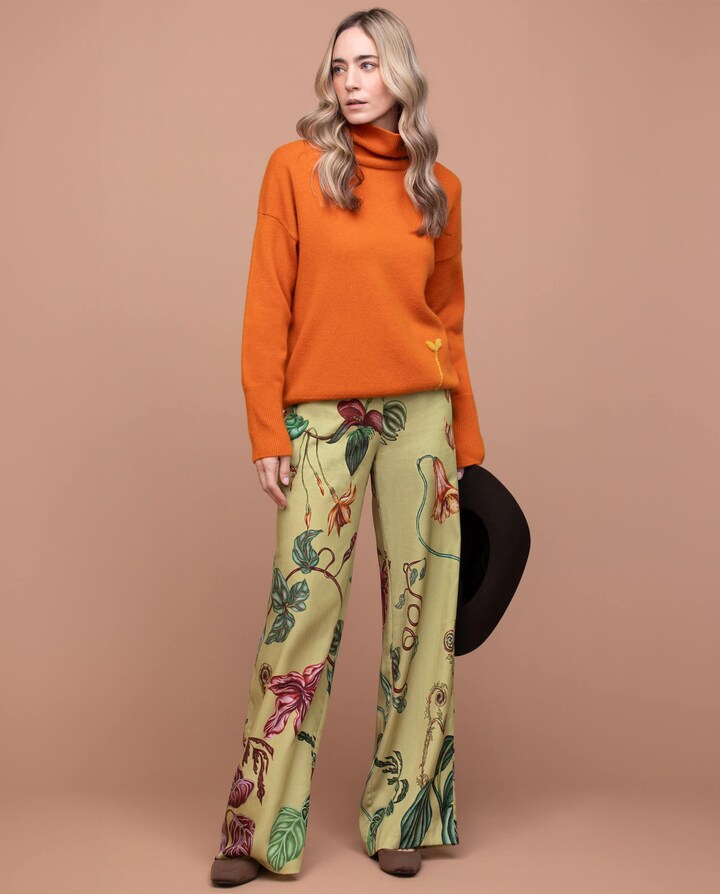 Calças wide-leg 100% lyocel com corte fluido. Sem cós. Fecho oculto na lateral. Dois bolsos. Perfeito para um look elegante. Estampado “Botanic” digital all-over exclusivo Greenkiss. Todos os nossos estampados foram desenhados e pintados a mão por artistas plásticos portugueses.
