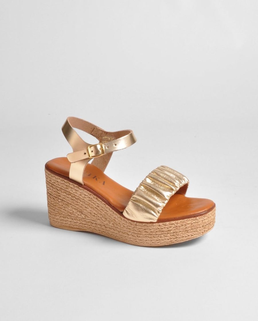 Sandália de cunha em laminado platino. Produzidos em Portugal.