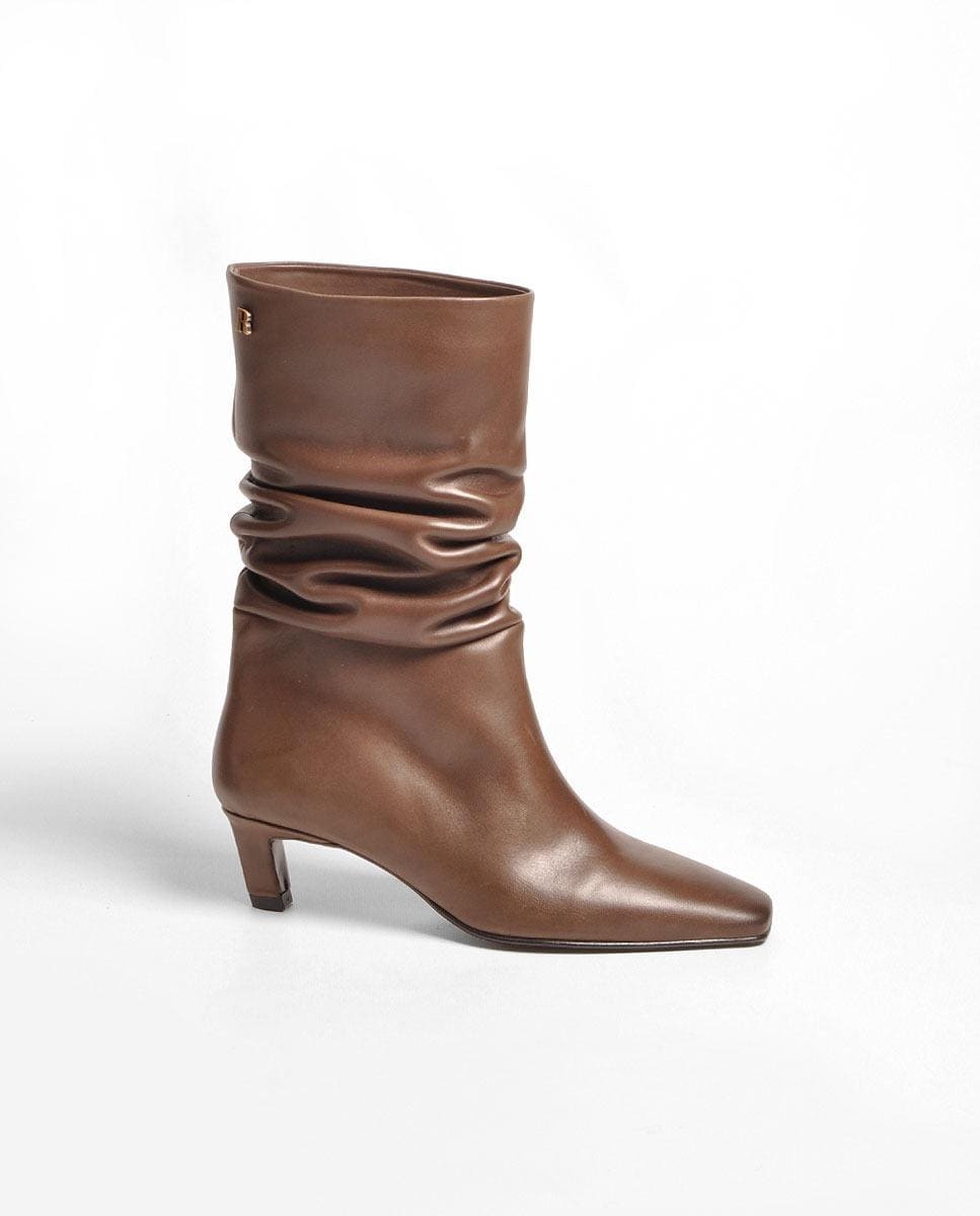 Botas de mulher com cano enrrugado em pele castanho. Produzidos em Portugal.