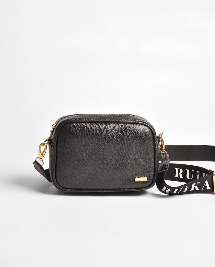 Mala de tiracolo pequena em pele preto. Possui um compartimento com fecho de correr. Dispõe de uma alça ajustável para levar a tiracolo; Medidas 15 x 22 x 7 cms.