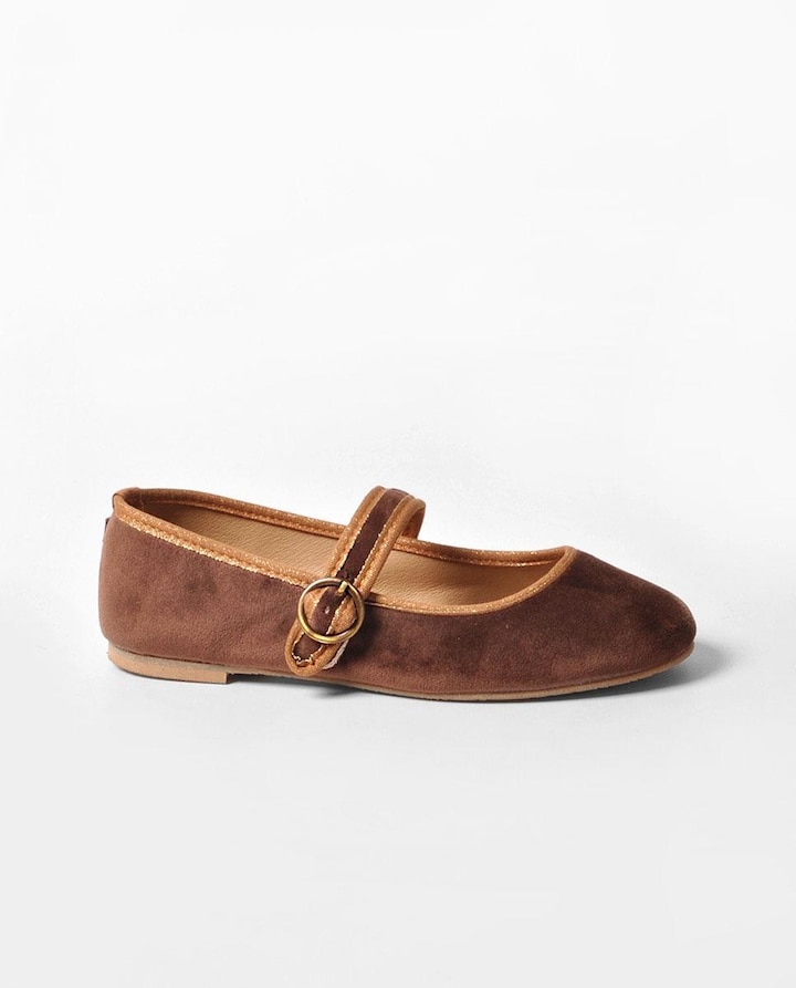 Sabrina de mulher em veludo castanho com tira e fivela. Produzidos em Portugal.