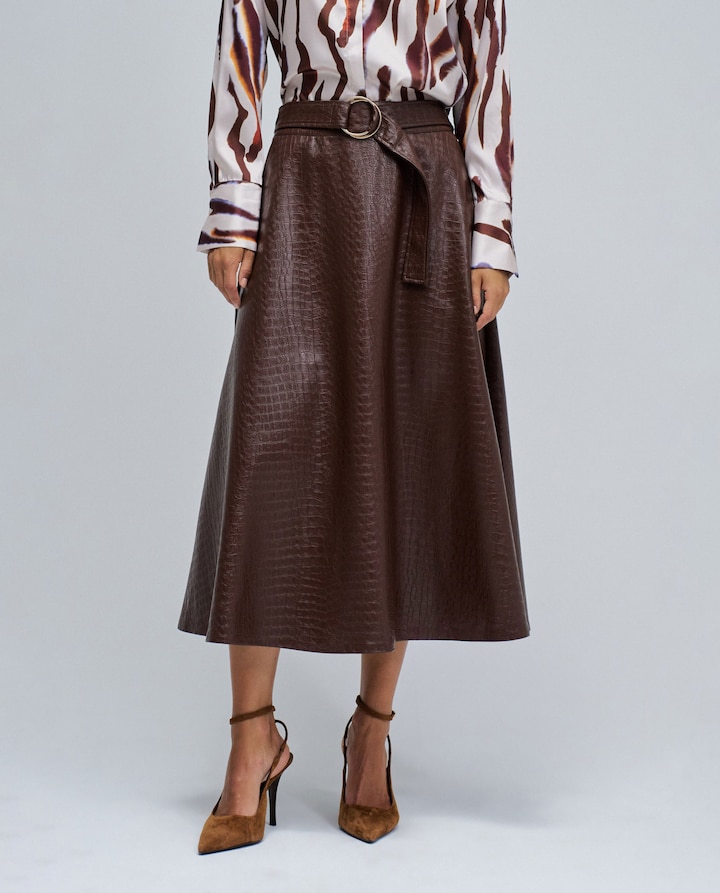 Nesta saia midi de efeito pele, o inverno encontra a sua expressão mais envolvente. Com textura de crocodilo, traduz a intensidade de quem avança com confiança. O cinto com fivela metálica marca a cintura com um toque elegante e subtil. O corte midi e o ajuste regular criam um movimento fluído, pensado para acompanhar cada passo com leveza e atitude. Forrada para maior conforto, com bolsos discretos e fecho posterior, é uma peça que une estilo e conforto. Perfeita para contrastar com tecidos suaves ou com camisas de corte preciso, é a peça que transforma o look e afirma a temporada. Saia efeito pele com cinto. Comprimento midi. Com efeito crocodilo. Ajuste regular. Com forro. Dois bolsos. Abertura com fecho posterior. Para referência, a modelo mede 1,78m e está usando o tamanho S.