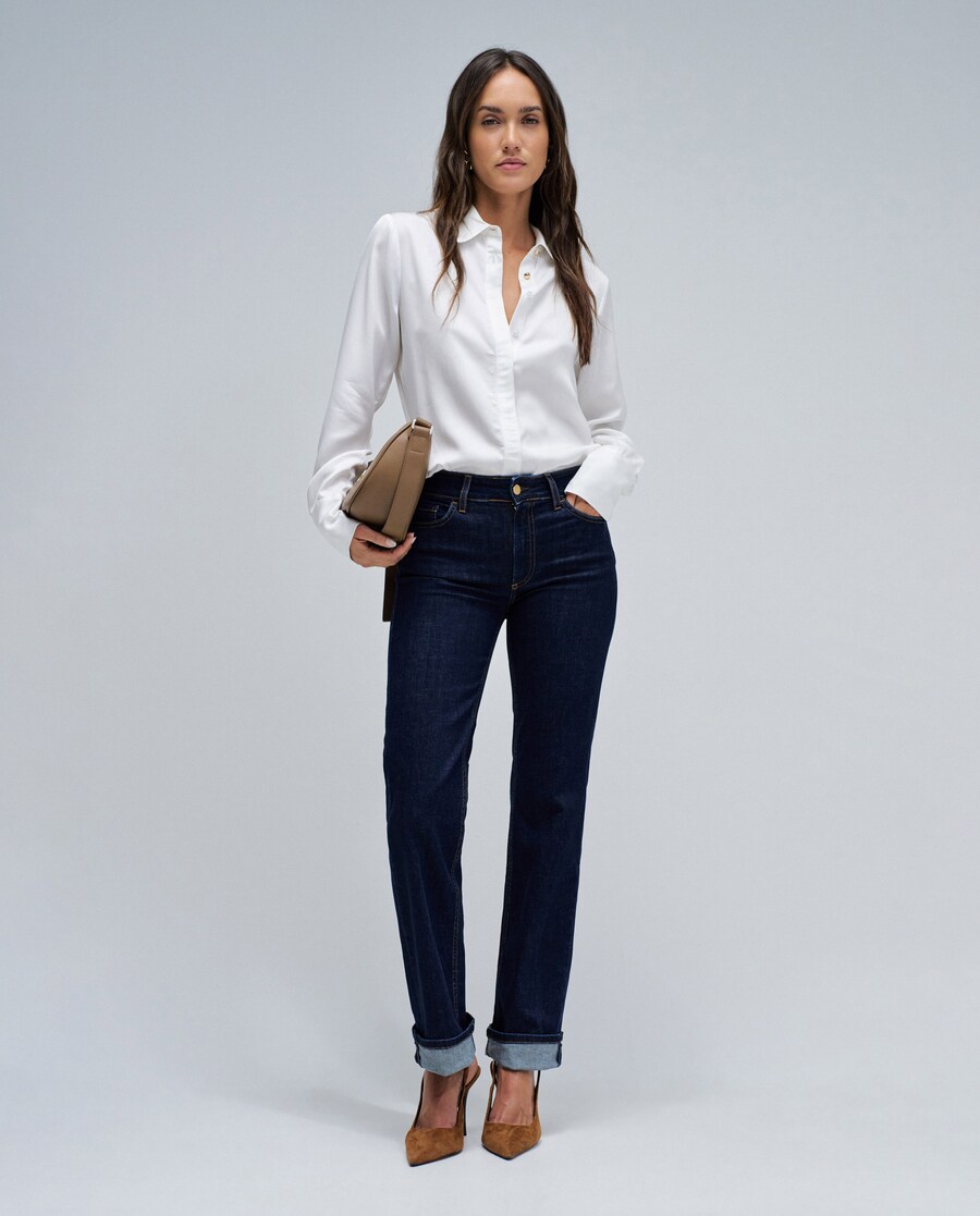 Destino Straight: o efeito Push Up, agora com um novo corte de perna straight, pensado para realçar a silhueta com naturalidade e dar um toque contemporâneo ao teu dia a dia. Com entrepernas média, bolsos estratégicos, costuras e pinças posteriores que modelam suavemente, os Destino Straight foram criados para acompanhar as tuas curvas e elevar o teu estilo. Um equilíbrio perfeito entre conforto, estrutura e elegância. Para o trabalho, para o fim de semana, para tudo. Jeans Destino . Cor azul-escuro . Efeito push up . Perna straight . Entrepernas média . Abertura frontal com fecho de correr e botão . Cinco bolsos . Com presilhas . Para referência, a modelo mede 1,74m e está usando o tamanho 27. Os Push Up Destiny realçam perfeitamente as tuas curvas e fortalecem a tua silhueta.