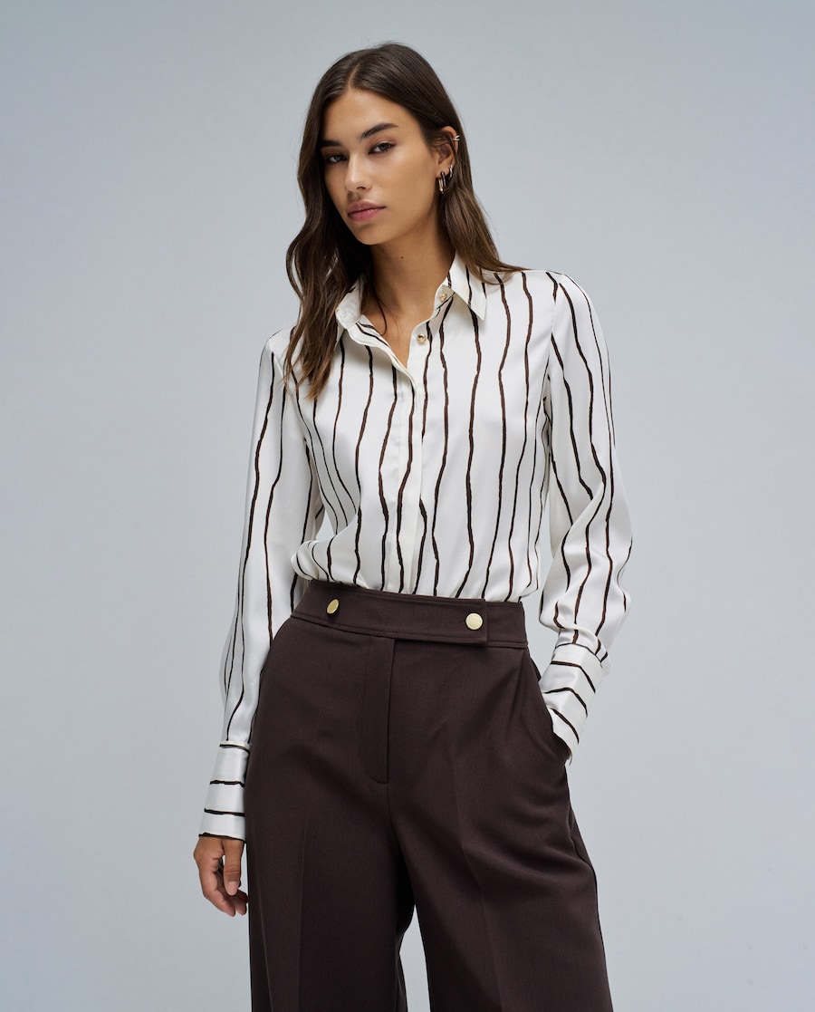 Esta camisa de corte regular, um básico que combina simplicidade e elegância. A abertura frontal está realçada por botões, que adicionam um toque sofisticado e moderno. A gola tipo camisa lhe dá um ar clássico e versátil, tornando-a perfeita para combinar tanto com jeans informais como com peças mais formais. Uma peça intemporal. Camisa básica acetinada. Corte regular. Gola tipo camisa. Abertura frontal com botões. Punhos com botões. Botões dourados na parte superior e nos punhos. Para referência, a modelo mede 1,77m e usa o tamanho S.