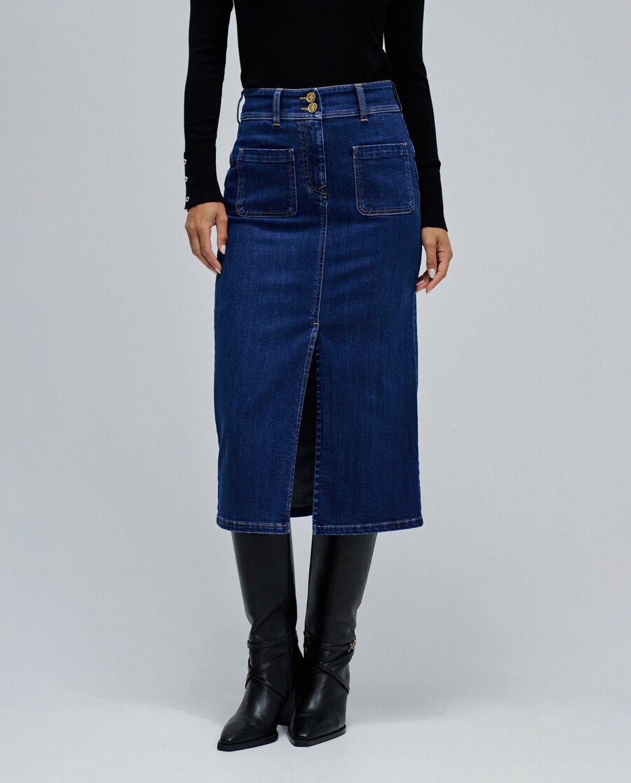 Esta saia midi tem uma elegância única. Está desenhada para oferecer o melhor de dois mundos: estilo e efeito modelador. Com cintura média e um painel interno de 360º, proporciona um ajuste perfeito na cintura e nos quadris, realçando de forma natural a silhueta feminina. O cinto com dois botões reforça a sustentação e acrescenta um detalhe distintivo ao look. O comprimento midi e a abertura frontal dão-lhe um toque moderno, enquanto os quatro bolsos e as presilhas garantem a funcionalidade de uma peça pensada para o dia a dia. Com fecho de correr frontal e um corte cuidadosamente estruturado, esta saia é a definição de confiança com sofisticação. . Saia secret . Cor azul-escuro . Cintura média . Efeito Push In . Comprimento midi . Abertura com fecho de correr e dois botões . Quatro bolsos . Abertura frontal . Com presilhas