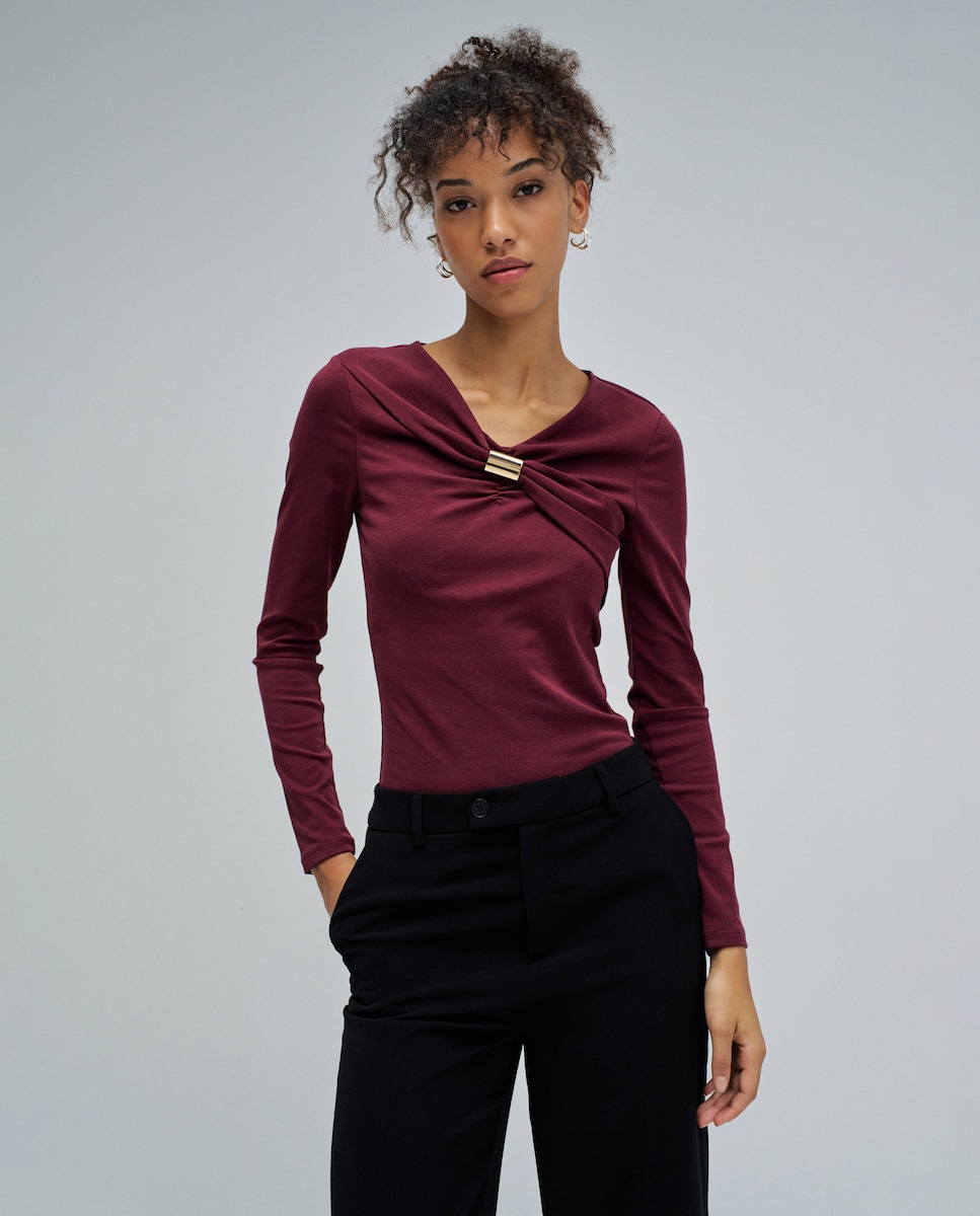 Um sweatshirt de malha em bordeaux que combina elegância discreta com um toque especial. O ajuste slim realça a silhueta, mantendo o conforto para o dia a dia. As mangas compridas e o decote em V criam uma linha feminina e harmoniosa, destacada pela aplicação metálica dourada que adiciona um brilho subtil e um detalhe distintivo ao design. Ideal para looks que requerem sofisticação sem esforço.- Sweatshirt de malha- Cor bordeaux- Ajuste slim- Manga comprida- Decote em V com aplicação metálica douradaPara referência, a modelo mede 1,78m e está usando o tamanho S.
