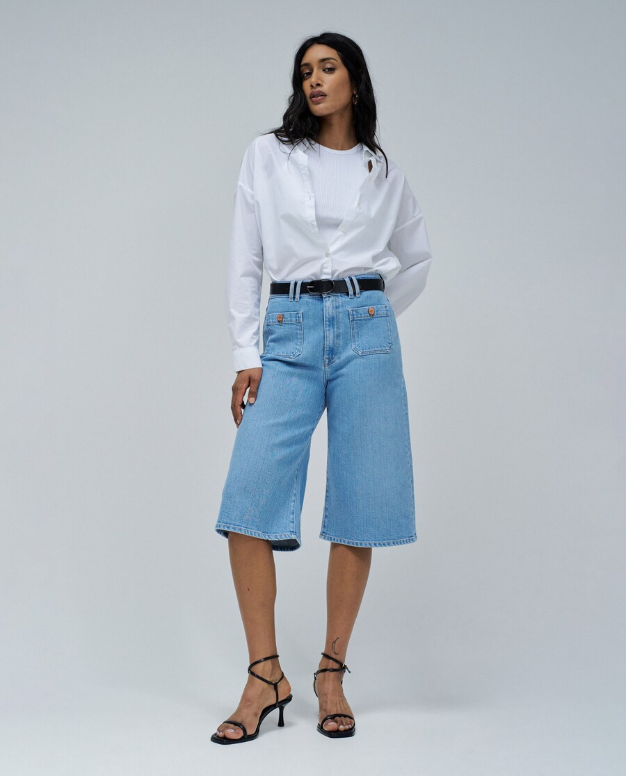 Livre, leve e luminosa: assim te sentirás ao vestir uma peça em lightdenim. Mais do que um tecido, é uma experiência de verão na pele: o fresco toque que te envolve, a suavidade que acompanha cada movimento, e a leveza que te faz andar como se estivesses sempre livre. O lightdenim é fluido, respirável e confortável, pensado para quem valoriza o bem-estar sem renunciar à elegância. Sofisticado na caimento e relaxado no espírito, adapta-se ao corpo com naturalidade, criando silhuetas soltas, modernas e cheias de liberdade. Ideal para os longos dias de calor, as manhãs claras ou as tardes que pedem pôr do sol, esta é a escolha certa para quem vive o verão com estilo e leveza. Veste-te com uma lufada de ar fresco. Porque só é verão quando te sentes assim. - Culotte em lightdenim - Cor azul - Tiro alto - Abertura frontal com fecho de correr e botão - Quatro bolsos, dois deles frontais - Com presilhas Para referência, a modelo mede 1,75m e está usando o tamanho 28.
