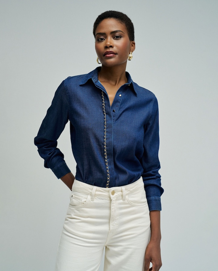 Esta camisa em denim azul combina elegância relax com detalhes sofisticados, convertendo-se numa peça versátil para diferentes ocasiões. O tecido fluído proporciona conforto e uma caída natural, enquanto o corte feminino realça a silhueta de forma sutil. O detalhe metálico dourado ao longo da abertura frontal é o ponto focal, adicionando um toque de originalidade e sofisticação, elevando o clássico denim. Com mangas compridas e gola clássica, é uma camisa fácil de combinar, perfeita tanto com jeans para um look casual chic, como com calças claras ou de alfaiate para uma proposta mais cuidada e contemporânea. - Camisa light denim - Corte regular - Decote gola - Mangas compridas com punhos com botões - Detalhe corrente ao longo da abertura frontal - Abertura frontal com botões ocultos. Para referência, a modelo mede 1,80m e usa o tamanho S.