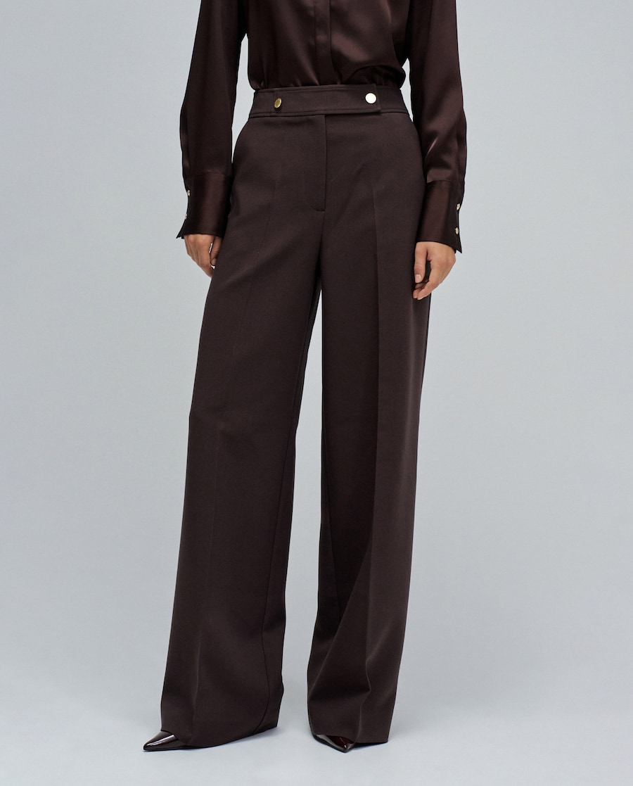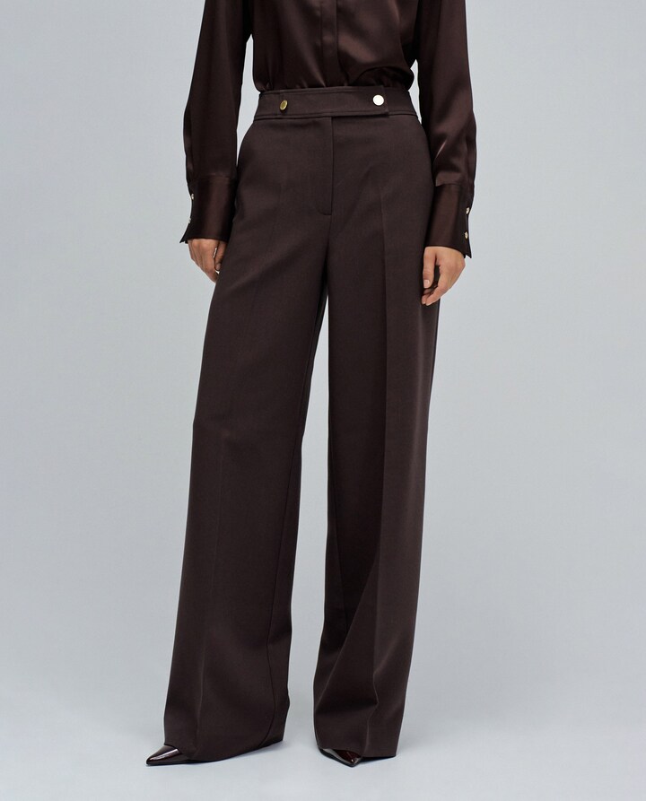 Estes calças de tecido castanho com perna wide são perfeitas para um look sofisticado e atemporal. A abertura frontal com fecho e os dois bolsos garantem conforto e praticidade. Os botões dourados acrescentam um toque elegante e distintivo a esta peça. Versáteis, são ideais para várias ocasiões, mantendo-te sempre com estilo. Calças de tecido. Cor castanho. Perna wide. Tiro alto. Abertura com botões duplos e fecho de correr. Dois bolsos estilo chino. Para referência, a modelo mede 1,73m e está usando o tamanho S.