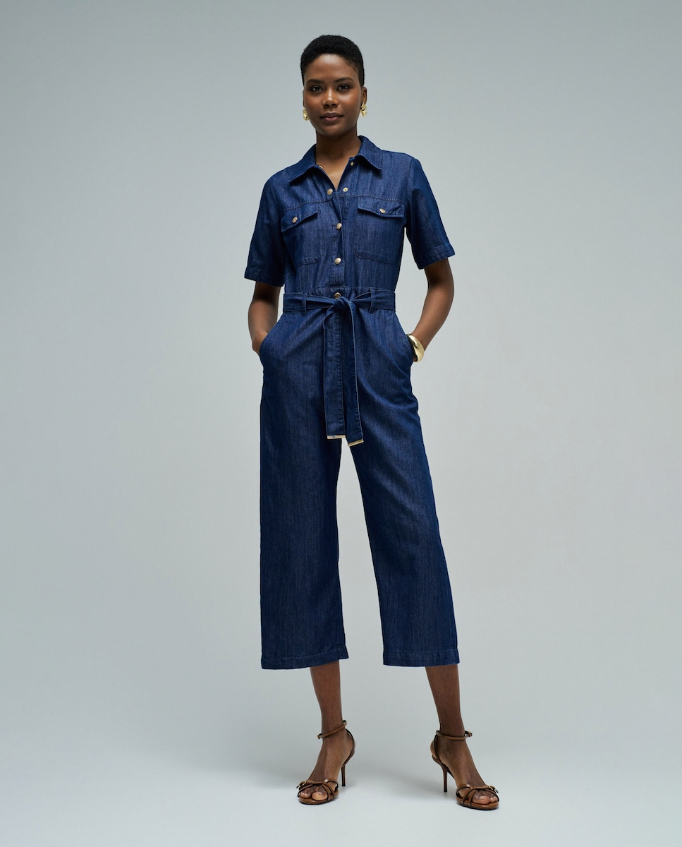 Este macacão é uma peça indispensável no teu armário. De perna cropped, este macacão em light denim é fresco, suave, delicado e confortável. Com abertura de botões, inclui um cinto removível para ajustar a cintura e realçar a tua silhueta. Combina-o com sandálias ou sapatilhas, uma mala e estarás pronta em um minuto.- Macacão light denim- Perna cropped - Mangas curtas- Seis bolsos, dois deles no peito com botão, dois bolsos laterais e dois posteriores não funcionais- Decote de gola- Com cinto removível- Abertura com botões e fecho de correr.