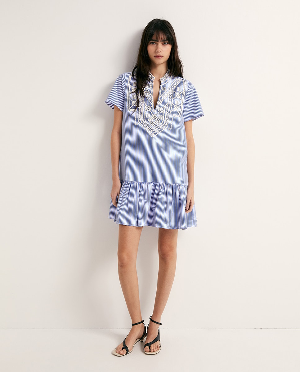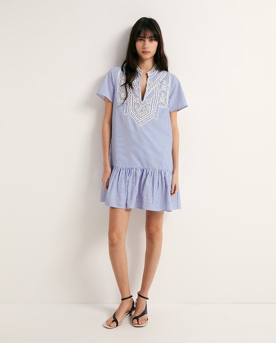 Vestido Curto Franzido de Algodão Elástico Às Riscas