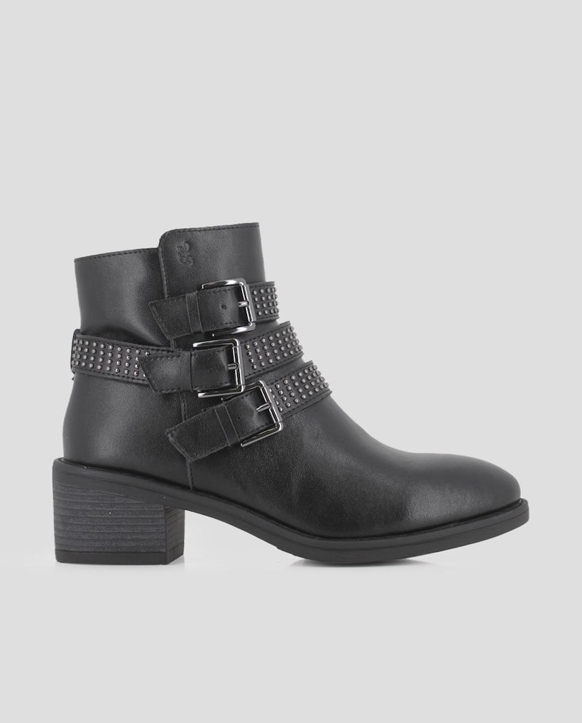 Botins com Salto Largo em Pele com Decorações e Fivelas