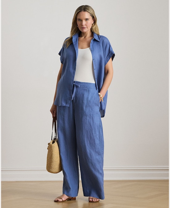 Calças Tamanhos Grandes de Perna Larga em Linho