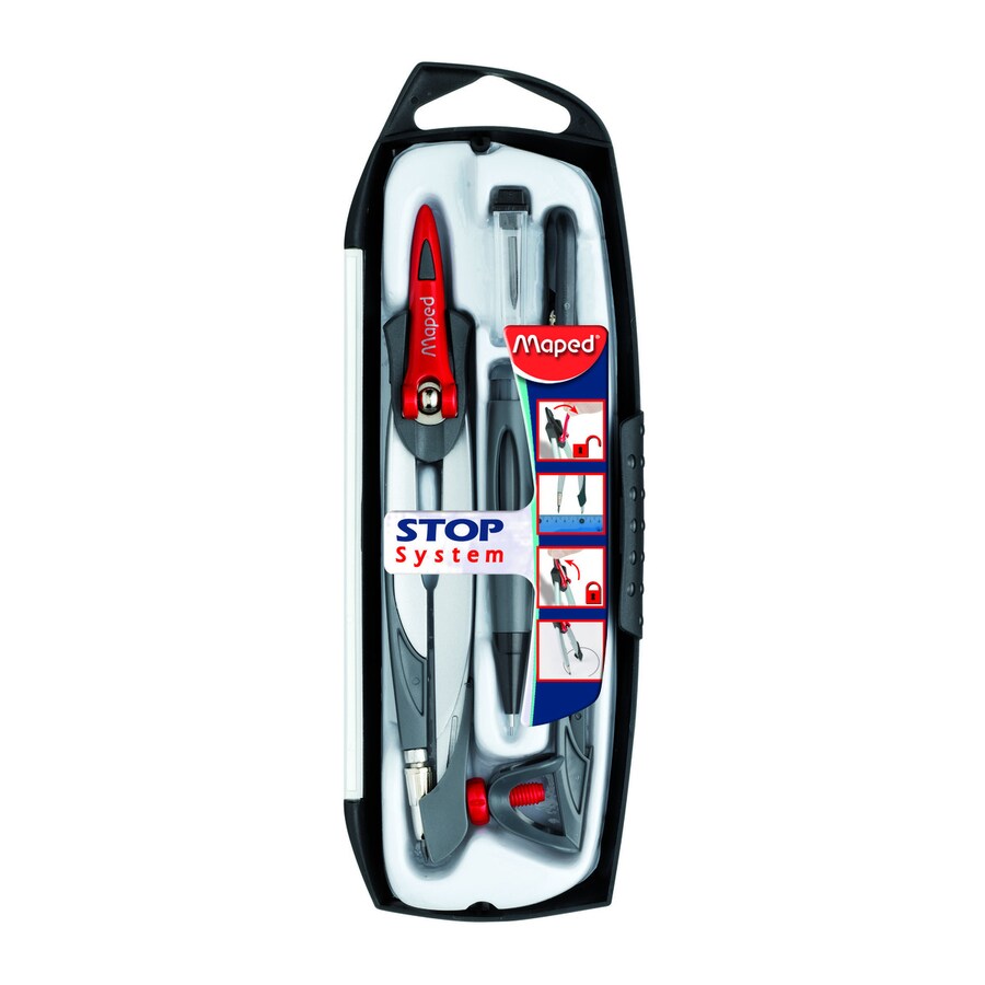 Maped Compasso Maped Stop 5 Peças. Compasso com sistema de bloqueio dos braços. Estojo com compasso e adaptador universsal para lápis. Inclui minas e afia. Ideal para a escola.