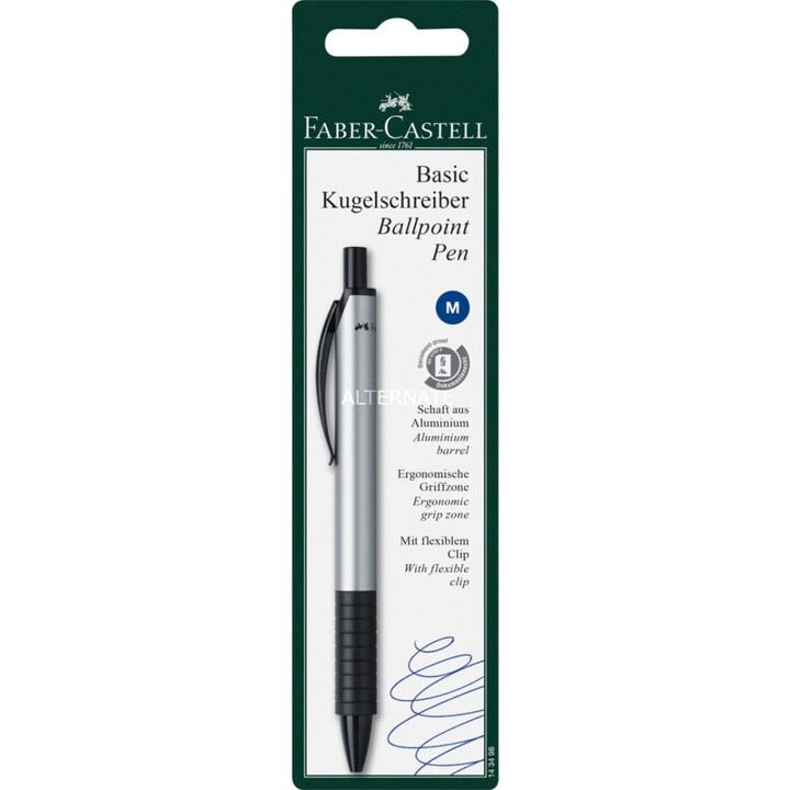 A caneta esferográfica Faber-Castell Basic tem um corpo prateado, um clipe de metal e está equipada com uma recarga padrão ISO à prova de documentos azul. A mina é substituível.
