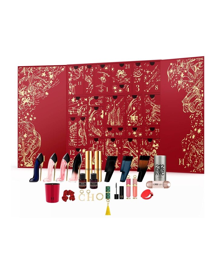 Abrace a magia da época festiva com este espetacular calendário do advento, apresentado numa caixa vermelha com uma ilustração fantástica de uma ópera. Este calendário do advento contém fragrâncias, acessórios, maquilhagem e acessórios exclusivos: Good Girl 7ml, Good Girl Blush 7ml, Very Good Girl 7ml, Very Good Girl Elixir, 7ml Bad Boy 8ml, Bad Boy Cobalt 8ml, Bad Boy Elixir 8ml, 212 Vip Rosé 5ml, CH Women 8ml, Herrera Confidential Amazonian Rose 5ml, Herrera Confidential My Tobacco 5ml, Herrera Confidential Amethyst 5ml, Good Girl Travel Spray 10ml, Bad Boy Travel Spray 10ml, Liquid Blush 1070 Rose Jasmine, Gloss 985 Orange Delight, Smudgeproof Mascara 2ml, Fabulous Kiss Blur Matte Lipstick 741 Nude Supreme com Concha de Ondas Verdes, Anel, Charm Letters C e H, Desodorizante Stick 212 Men 75ml, Grampo de Cabelo, Espelho e Vela Perfumada.
