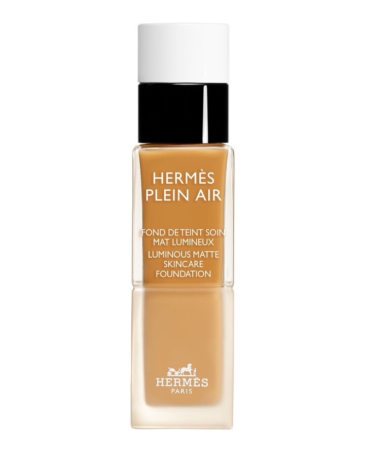 A base de maquilhagem Plein Air da Hermès é um produto concebido por Gregoris Pyrpylis que combina propriedades de maquilhagem e cuidados com a pele. Proporciona um acabamento mate luminoso e uma textura fluida que unifica o tom e disfarça imperfeições. A sua fórmula contém 82% de ingredientes tratantes, incluindo niacinamida para nutrir e suavizar a pele, ácido hialurónico puro para hidratação profunda e extrato de amoreira branca para redensificar e proteger a pele do stress oxidativo. Oferece uma duração de até 16 horas, sendo resistente ao calor, humidade e suor, mantendo a cor durante todo o dia. Além disso, melhora a hidratação e a firmeza da pele com o uso contínuo. Composto por 71% de ingredientes de origem natural, é não comedogénico e adequado para todos os tipos de pele, incluindo as mais sensíveis. Permite a aplicação com pincel ou dedos, modulando a cobertura de acordo com as necessidades. O frasco, desenhado por Pierre Hardy, inclui um dosificador que garante a quantidade adequada de produto para uma aplicação precisa.