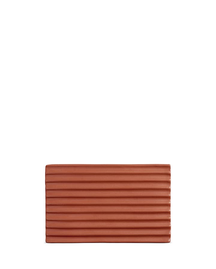 Saboneteira retangular em terracota elaborada - o acessório perfeito para apoiar o sabonete sólido da coleção LOEWE Home Scents. A saboneteira canelada facilita o escoamento da água, fazendo eco do design das nossas velas perfumadas e das tábuas de lavar tradicionais.