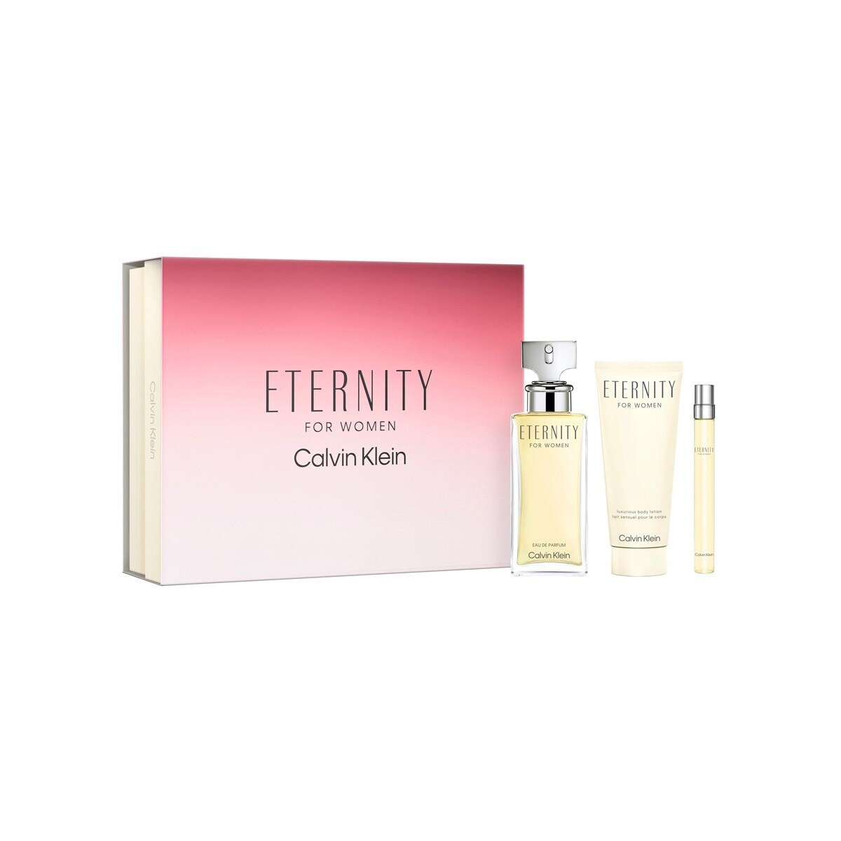 Este conjunto de perfume Calvin Klein inclui: Eternity Eau de Parfum for Women 100 ml + Eternity Body Lotion for Women 100 ml + Eternity Eau de Parfum for Women 10 ml.