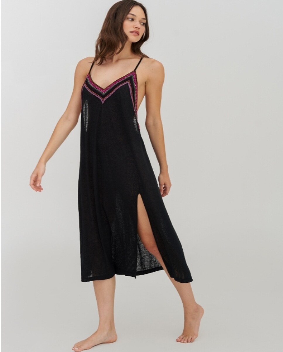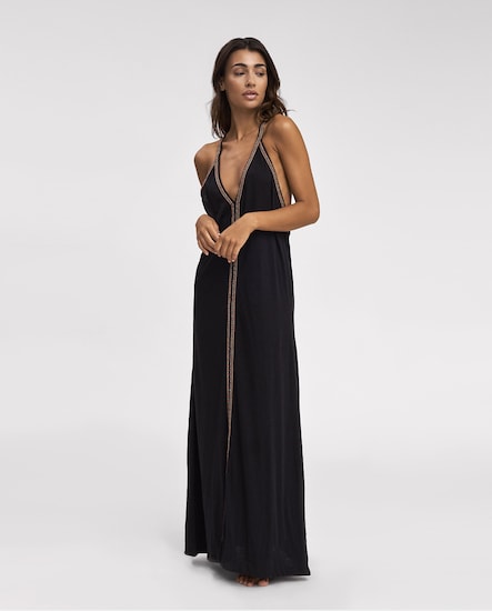 Kaftan Comprido de Alças com Detalhe em Contraste - Preto