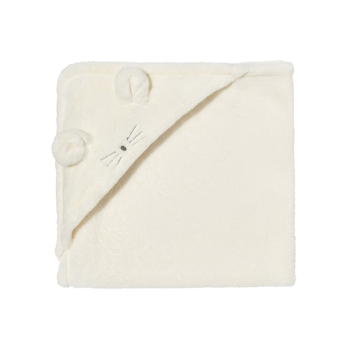 Manta para bebé com capuz e orelhas e pormenor de bordado.
