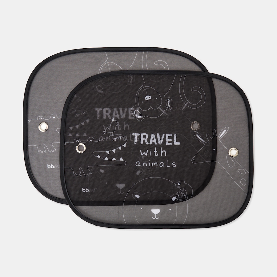 Conjunto de dois protectores solares para automóvel em preto com silhuetas de animais divertidos em branco.