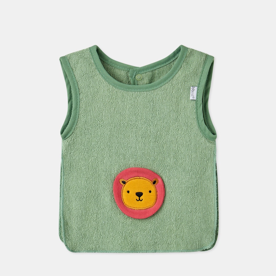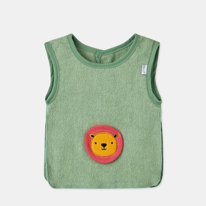 Babete individual comprido em tecido felpudo verde com remendo com cara de leão