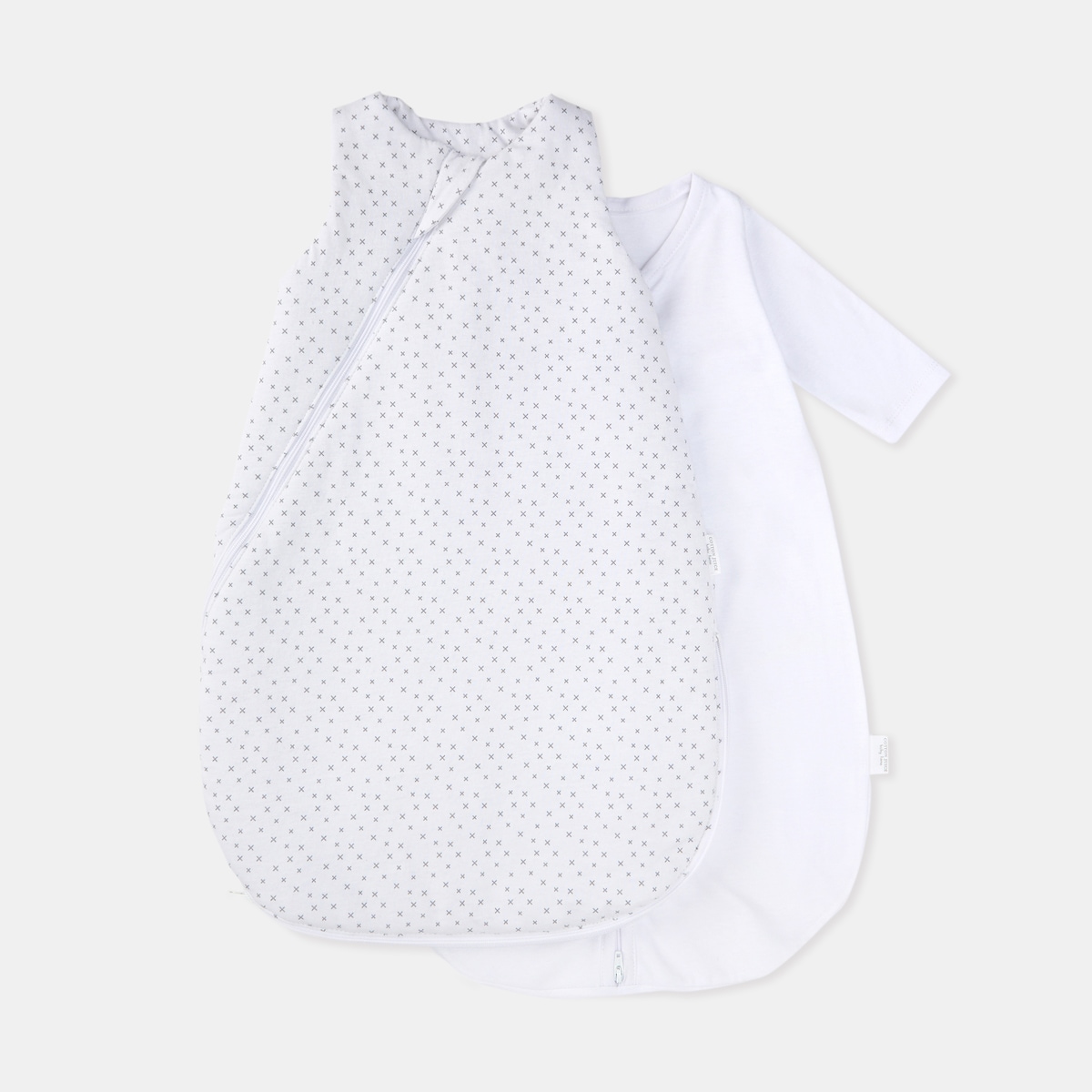 O saco interior é feito de camisola branca e tem mangas (tog 1). O saco exterior é igualmente de jersey branco com um desenho de lâminas cinzentas e sem mangas (tog 1,5). Este saco de duas peças dá-lhe a possibilidade de o utilizar em todas as estações do ano. No verão, pode utilizar apenas o saco interior nos meses mais quentes, nas estações intermédias, o saco exterior pode ser o mais adequado e, no inverno, uma combinação dos dois seria perfeita. Abertura lateral/frontal com fecho de correr e abertura de baixo para cima para facilitar a muda da fralda. A pega é coberta por um fecho de correr. O tecido é 100% algodão. Fabricado em Portugal