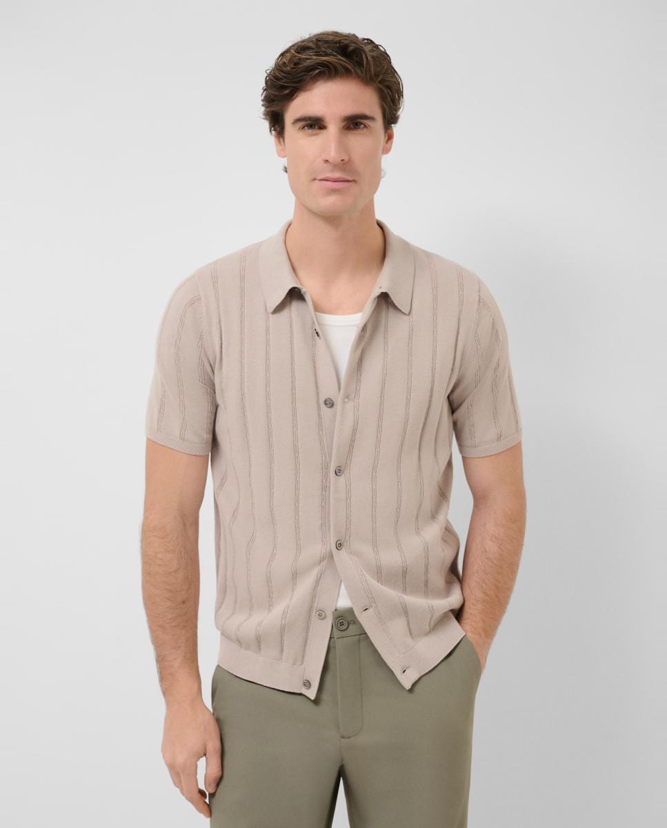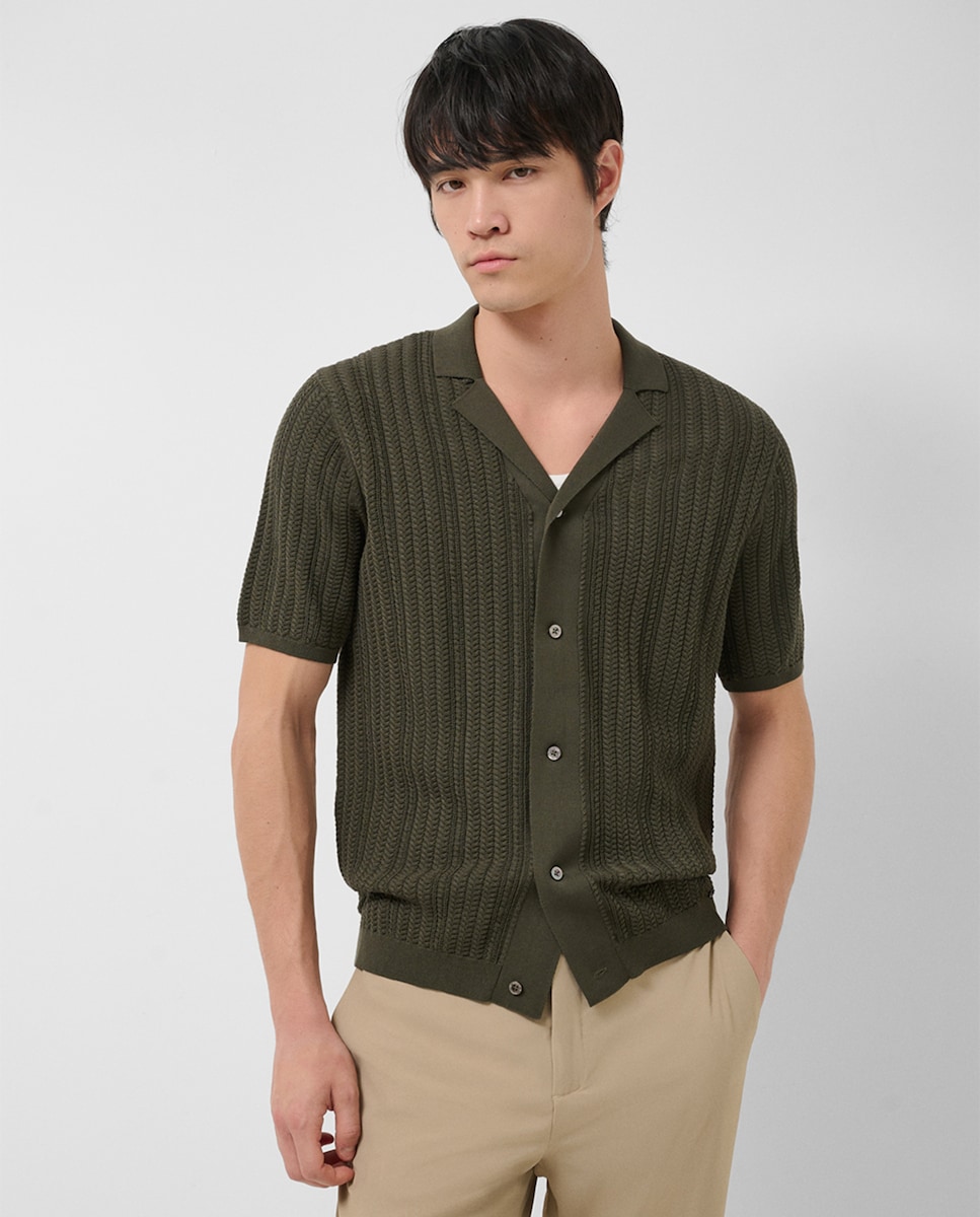 Polo Aberto Tricotado com Manga Curta e Padrão Espinha de Peixe