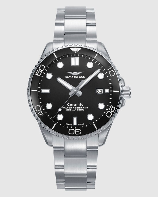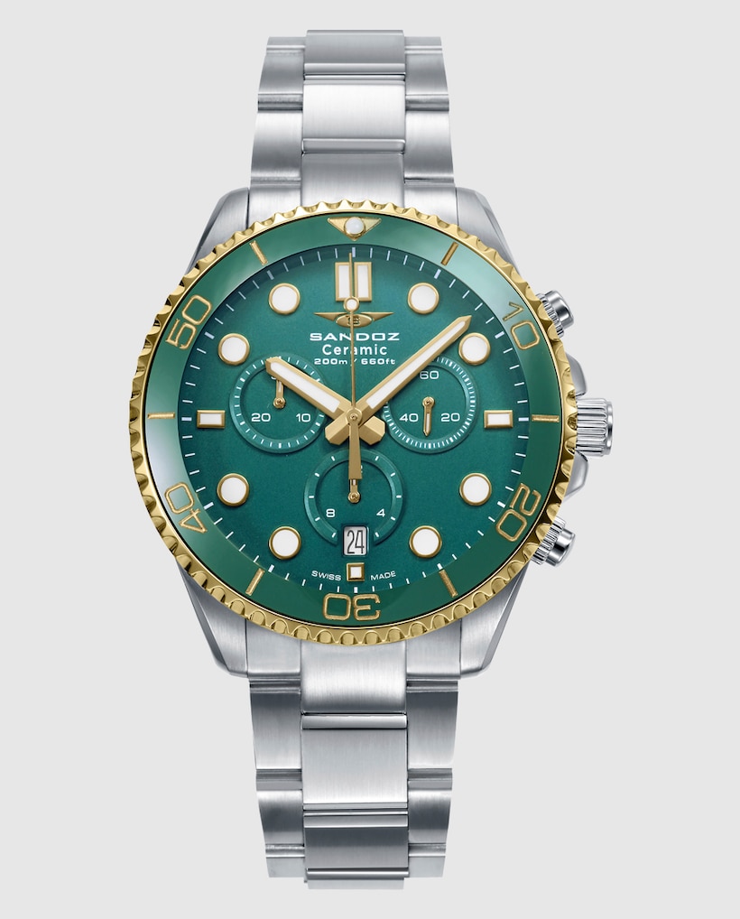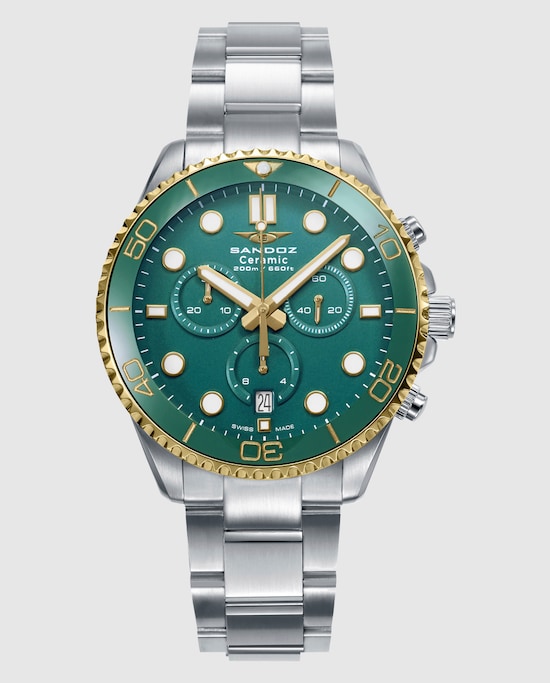 SandozRelógio Caixa Bitono de Aço e Ip Dourado com Bisel de Cerâmica em Verde e Bracelete BitonoAdicionar