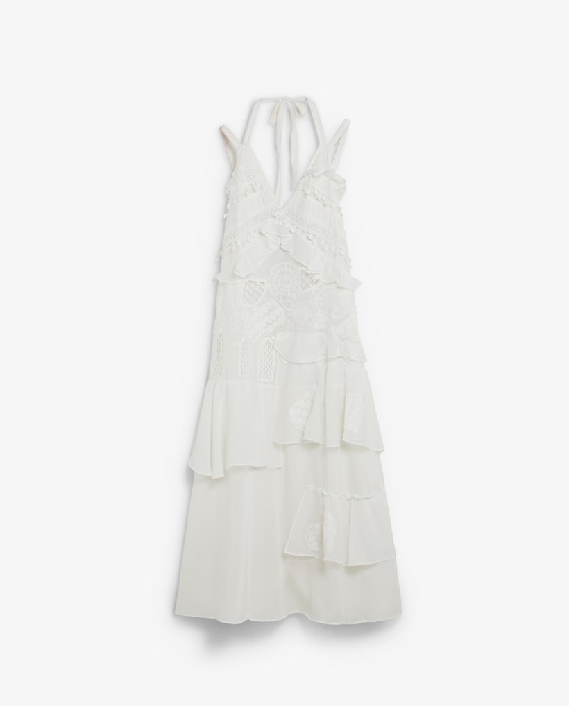 Vestido Comprido com Aplicações de Renda Bordada e Perfurados