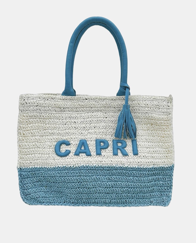 SienaMala de Ráfia Bicolor Entrançada à Mão com Aplique de Letras em Pele e Alças Suaves "Capri"Adicionar