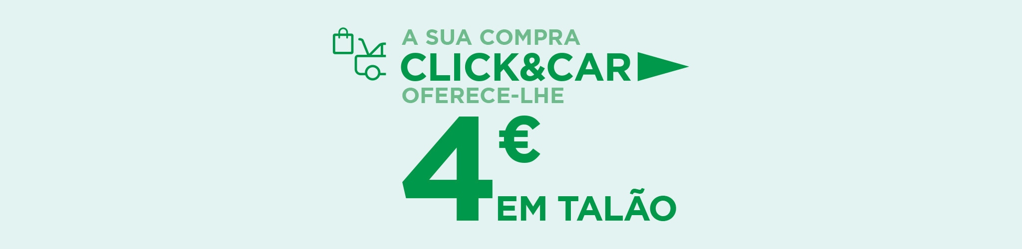 *Receba 4€ numa compra Click&Car de 12 de março a 22 de abril de 2026, em compras de artigos de Supermercado e Acessórios e Alimentação para Animais de companhia, para utilizar numa compra Click&Car a partir do dia seguinte à receção da sua compra e durante 15 dias desde a emissão do vale em compras superiores a 80€.