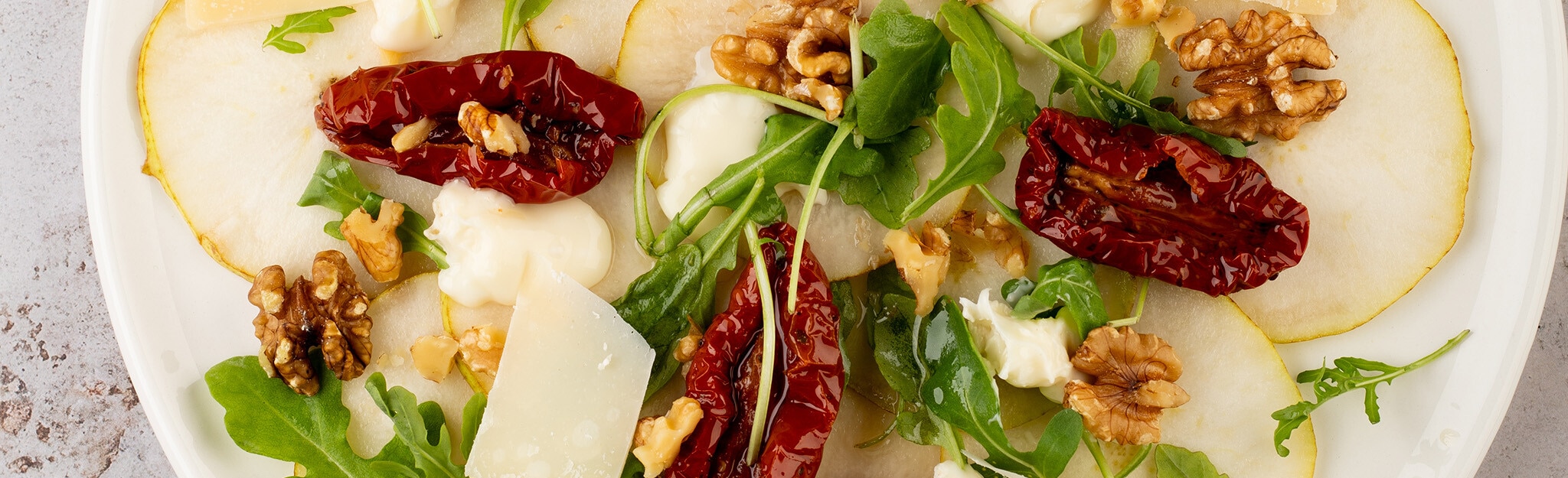 Num prato disponha a rúcula, depois as rodelas da pêra e por fim pequenos pedaços de queijo, nozes, pimenta rosa e o molho.