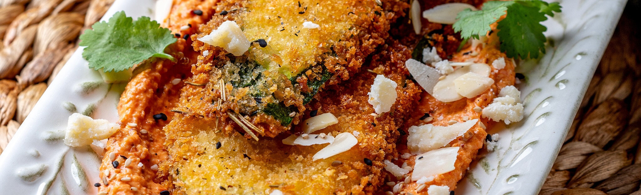 Cortamos a Curgete e passamos pela farinha, depois por ovo batido com sal e finalmente uma mistura de panko e queijo parmesão, alecrim e sal e pimenta, levamos para dourar em uma frigideira.