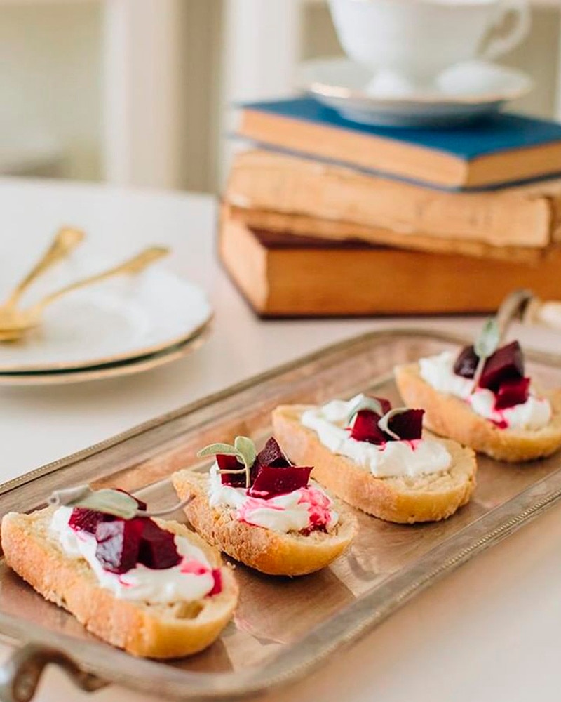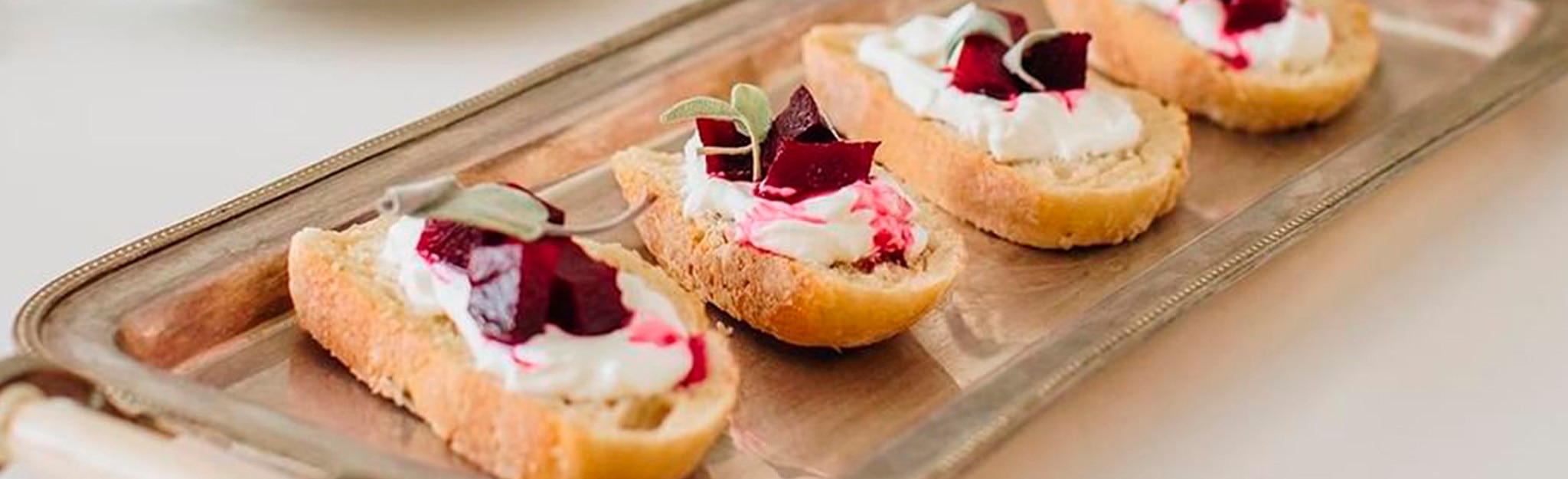 Espalhámos uma mistura de queijo de cabra em cada bruschetta criando uma "cama" e por cima a beterraba.