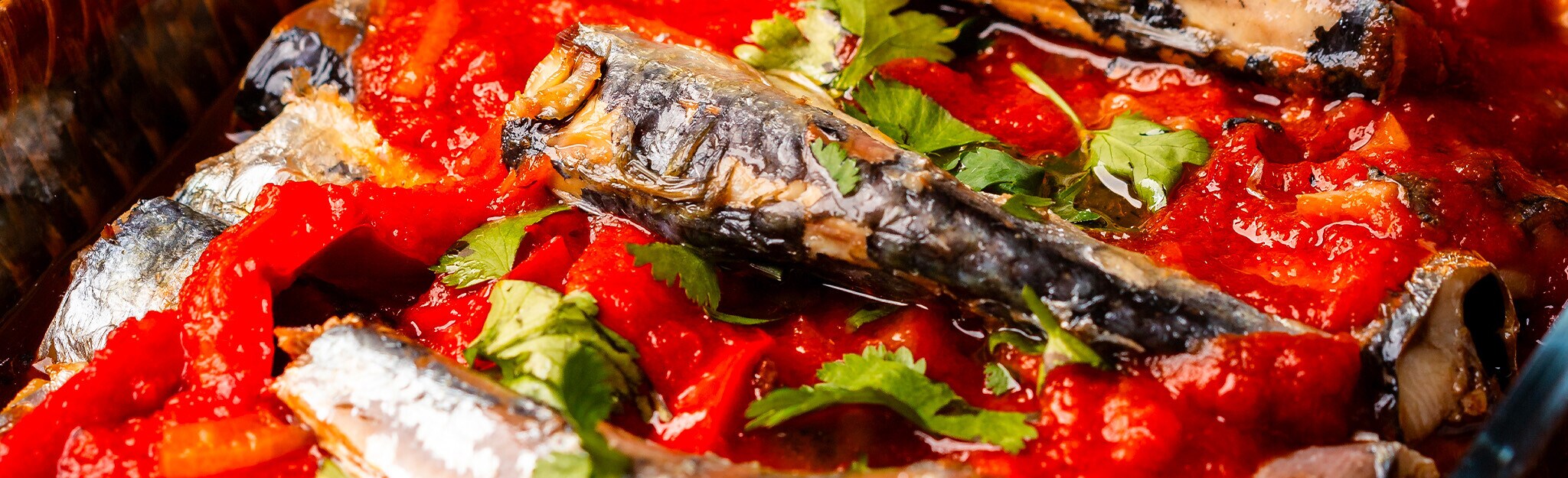 Desligue o lume, disponha na travessa as sardinhas, verta o molho de tomate e finalize com coentros frescos picados e os pimentos assados fatiados