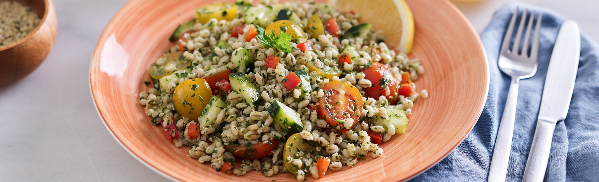 Junte a cevadinha (que pode substituir por quinoa, grão de bico ou abacate), polvilhe com mais um bocadinho de salsa e sirva.