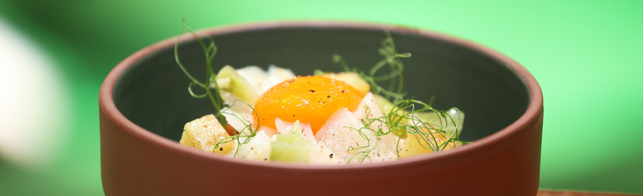 No prato colocar o puré de grão, as lascas de bacalhau espetadas, 3 quadrados de batata, grão crocante, 3 rolinhos de couve, a gema confitada e rebentos de ervilhas.