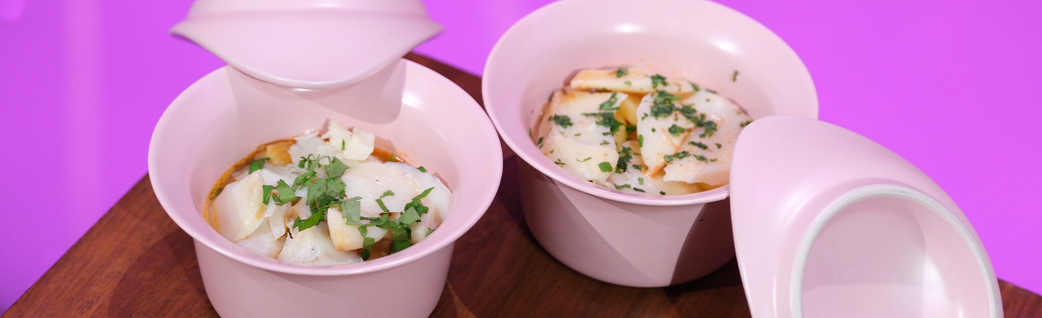 No prato colocar a cebola e o pimento, as batatas, as lascas de bacalhau e a salsa picada.