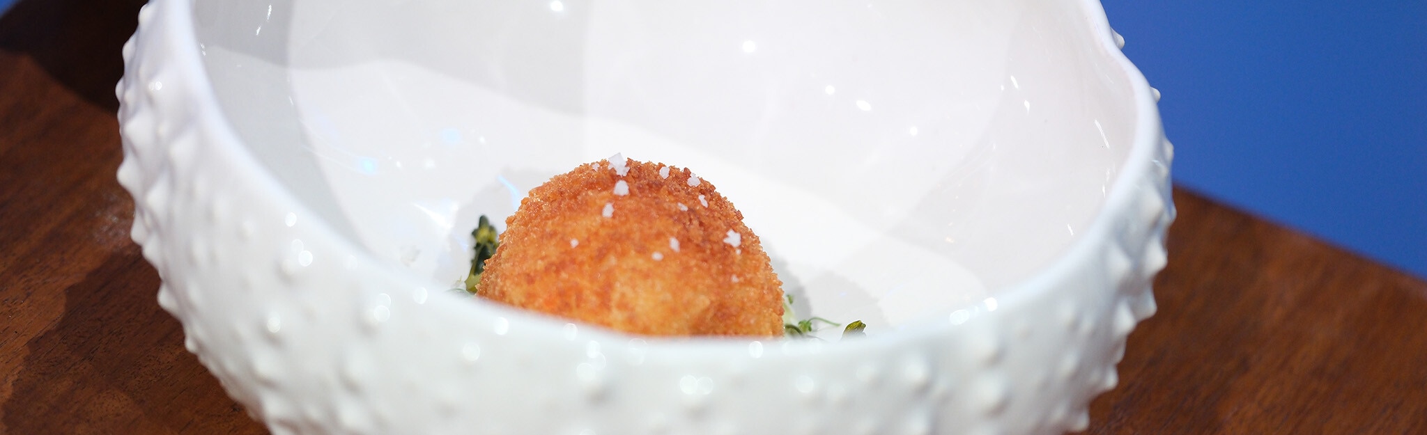 No momento de servir, os croquetes são fritos até ficarem dourados e crocantes, acompanhados pela maionese de coentros, os pickles de bimis e a espuma de caldo, resultando num conjunto equilibrado entre crocância, frescura e suavidade.