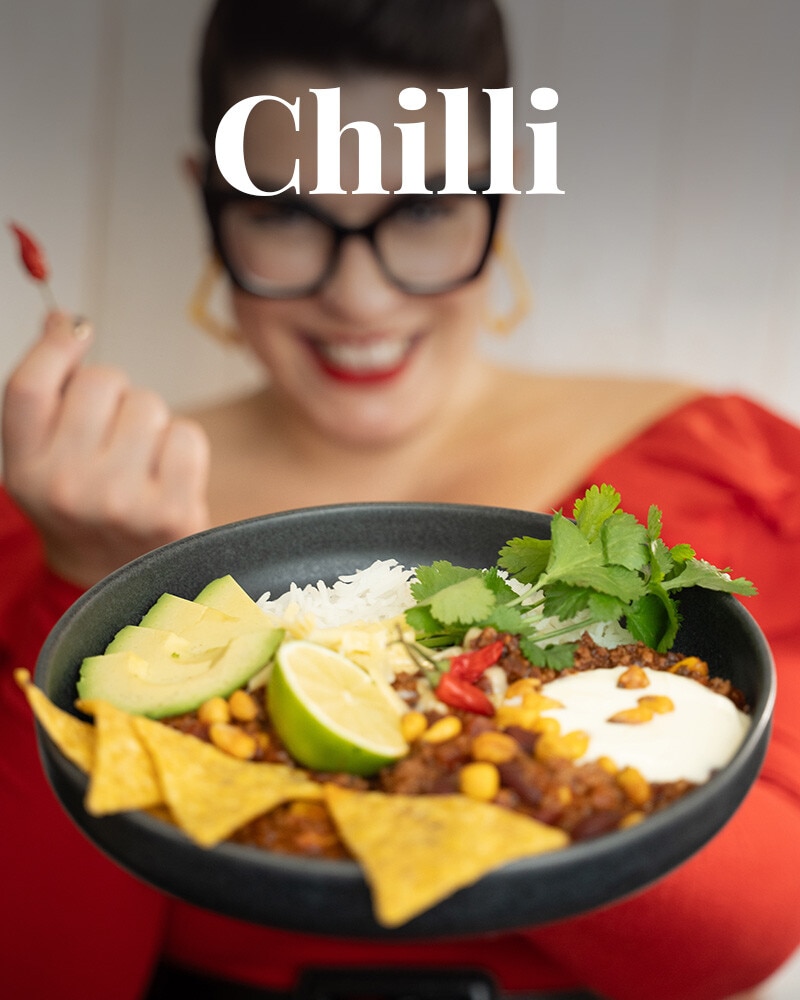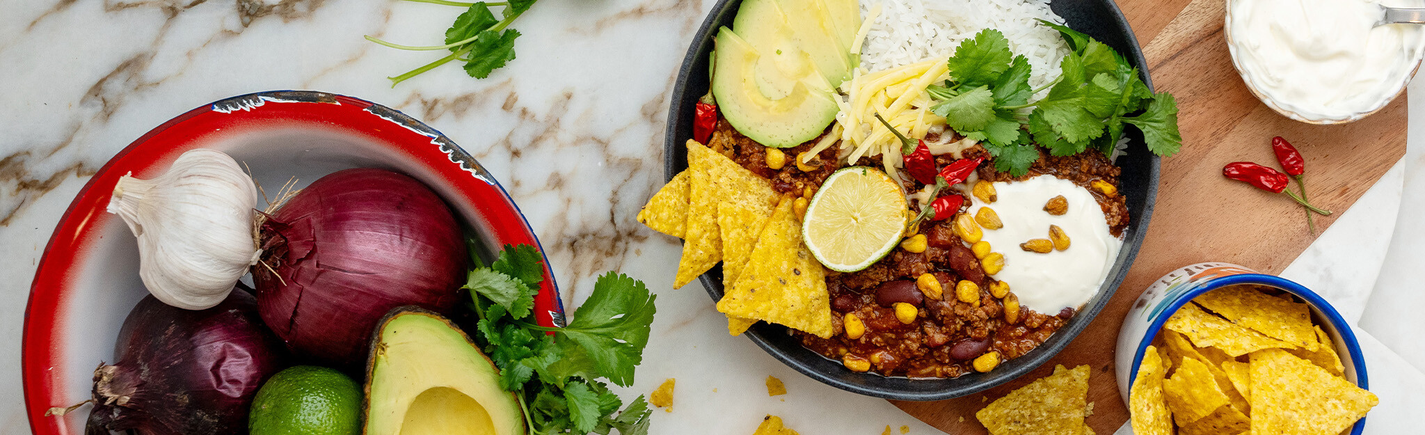 Para servir coloco o arroz na base, por cima o chilli apuradinho e junto abacate, coentros frescos, lima, creme fraiche, queijo cheddar ralado, milho frito e nachos.