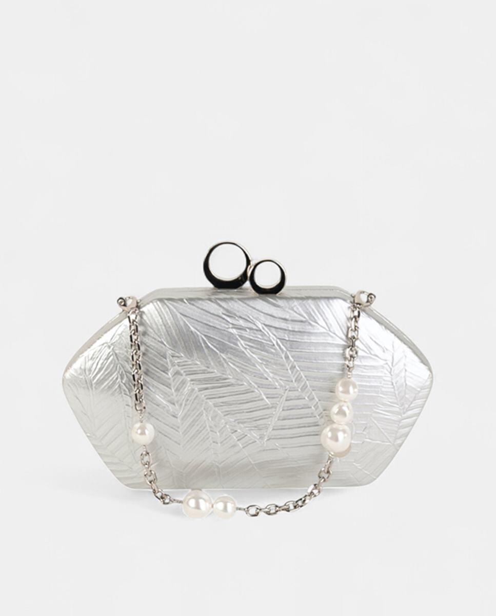VolumMala Clutch de Festa Pequena, Compacta e Rígida em Material Sintético Texturado com Corrente Decorativa com Pérolas e Fecho MetálicoAdicionar