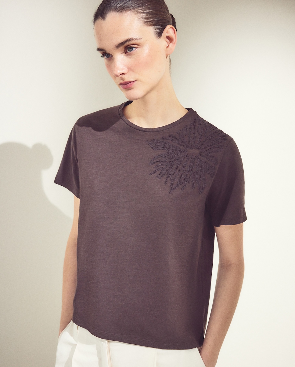 T-shirt de Manga Curta com Bordado Floral no Ombro